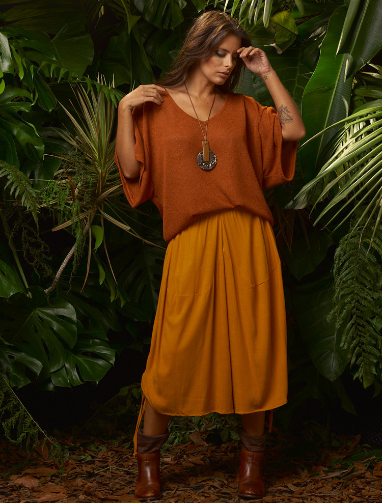Blusa em trico de viscose, com decote V. Tem a estrutura de uma camiseta mais ampla, trazendo assim um toque de modernidade ao visual.
