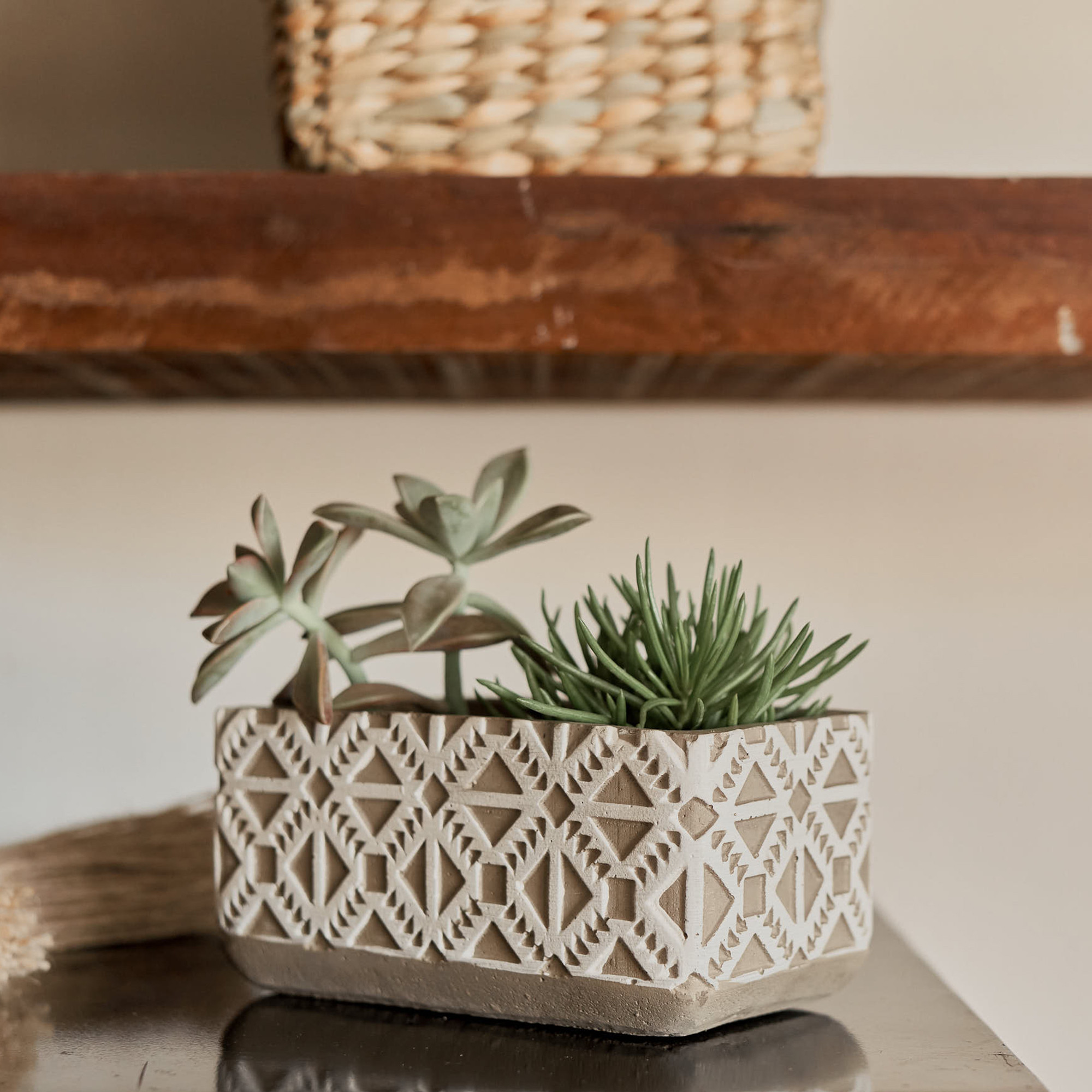 Peça fabricada em cimento com estampa étnica em relevo. Comporta plantas, velas e organização de objetos no geral.