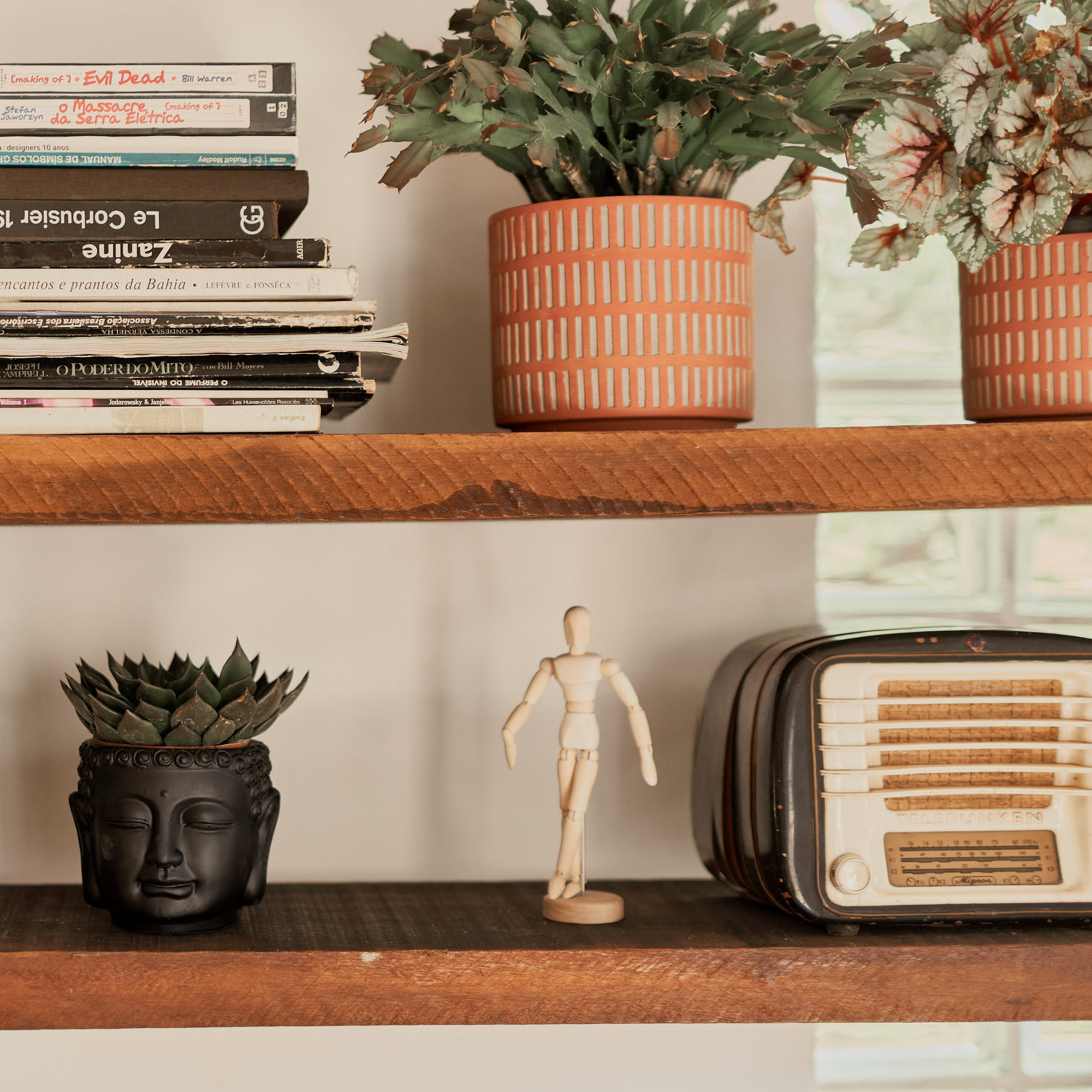 A peça comporta plantas, velas ou organização de objetos no geral.