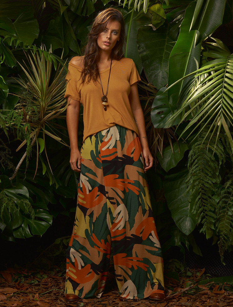 Detalhes do ProdutoMaxi prega frontalElástico na cinturaEstampa ExclusivaComposição96% Viscose04% ElastanoMedidas da PeçaU – CALÇAS - Comprimento 105 cm | Quadril até 117 cm | Cintura até 100 cm