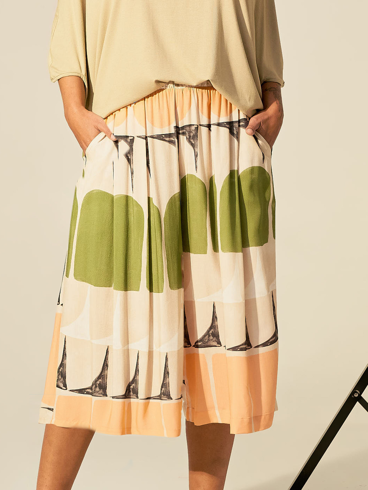 Detalhes do ProdutoEstampa exclusiva.Pantacourt.Bolsos laterais.Elástico na cintura.Composição