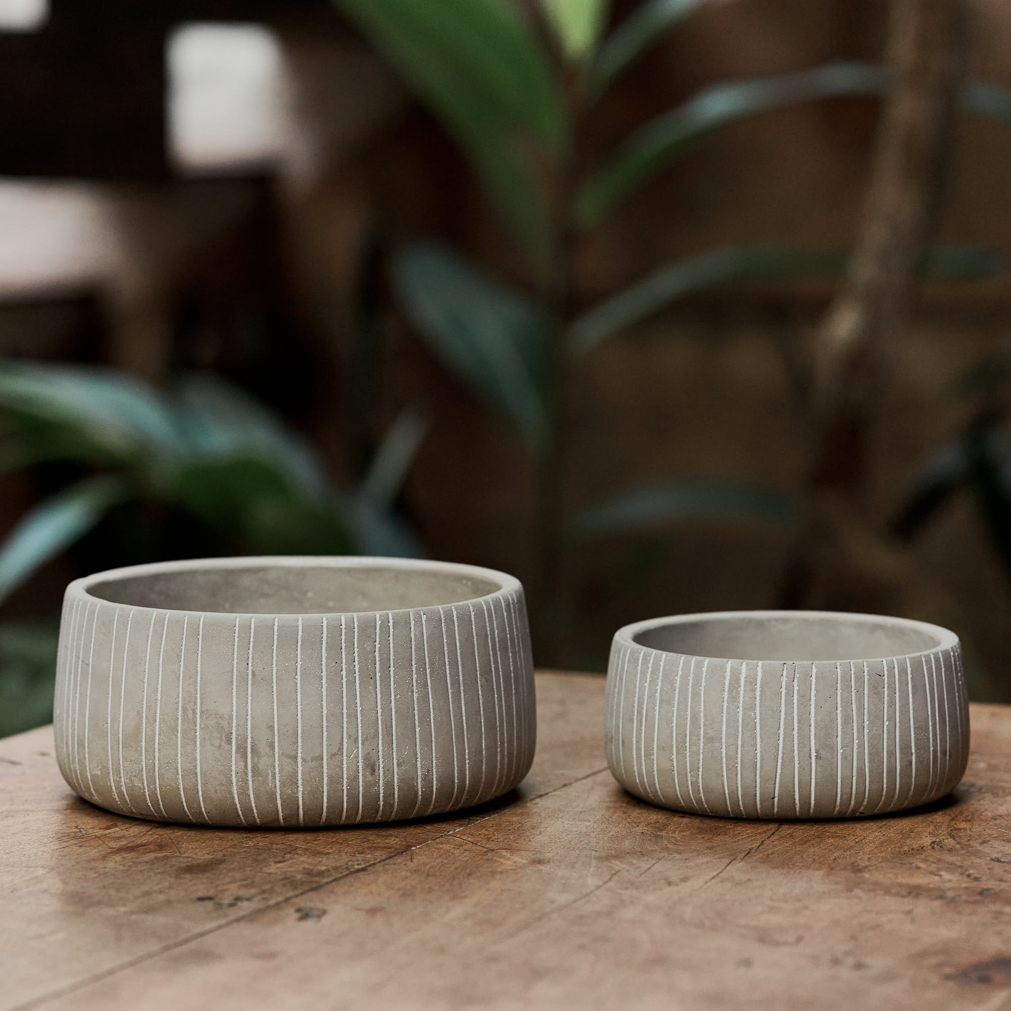 Jogo composto por duas peças de tamanhos diferentes, confeccionadas em cimento e em estampa de listras. Perfeito para decoração de ambientes, acomoda plantas, velas ou organização de objetos.