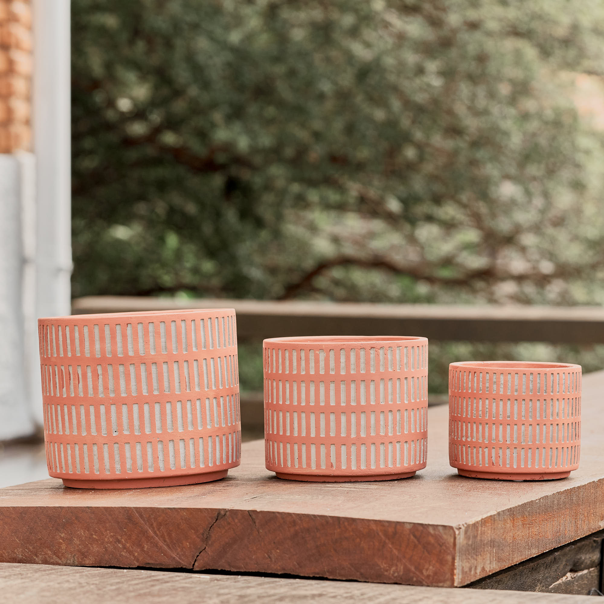 Jogo composto por três peças de tamanhos diferentes confeccionadas em cimento e estampa em traços com relevo. Perfeito para decoração de ambientes, acomoda plantas, velas ou organização de objetos.
