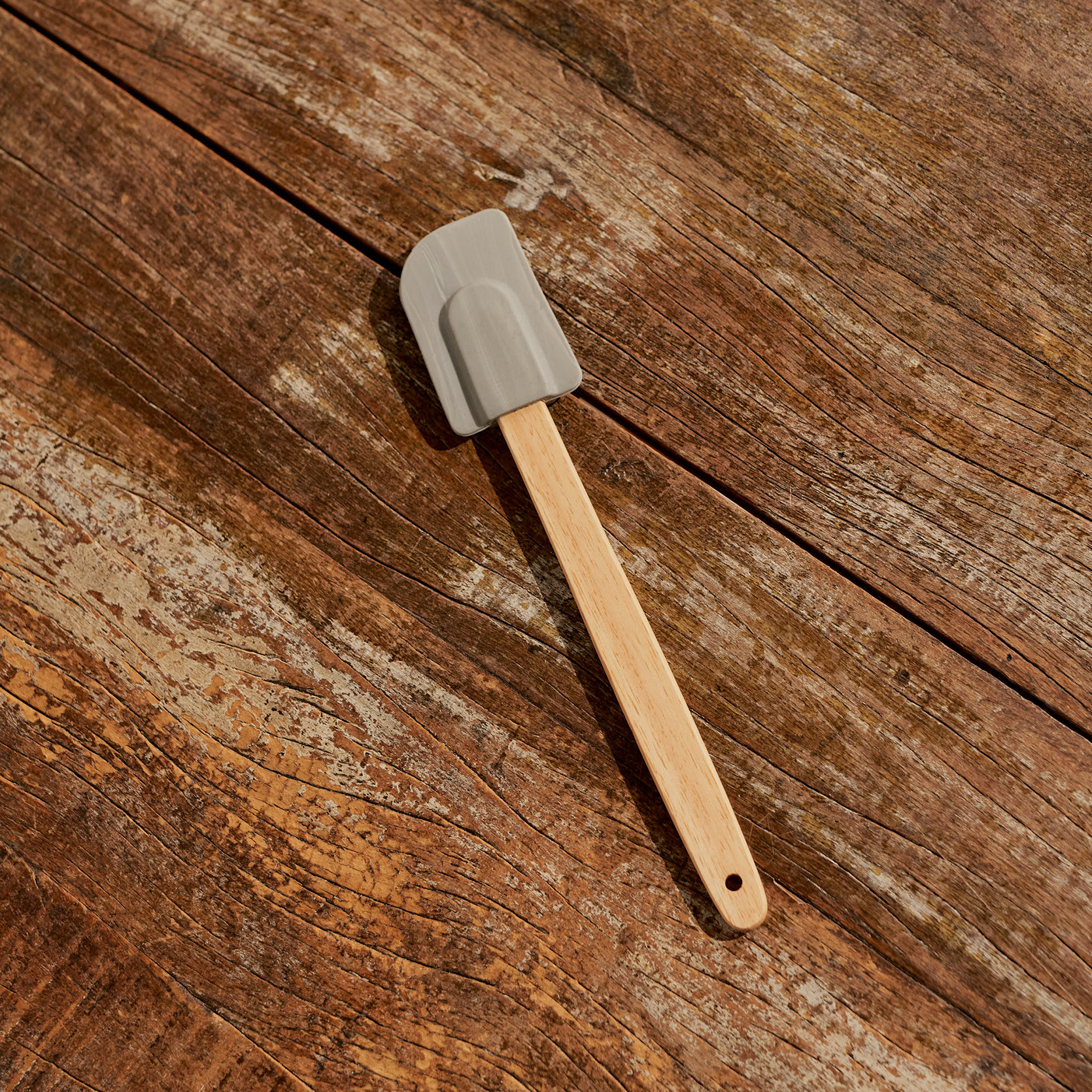 Espátua Pão Duro confeccionada em silicone com cabo de madeira.