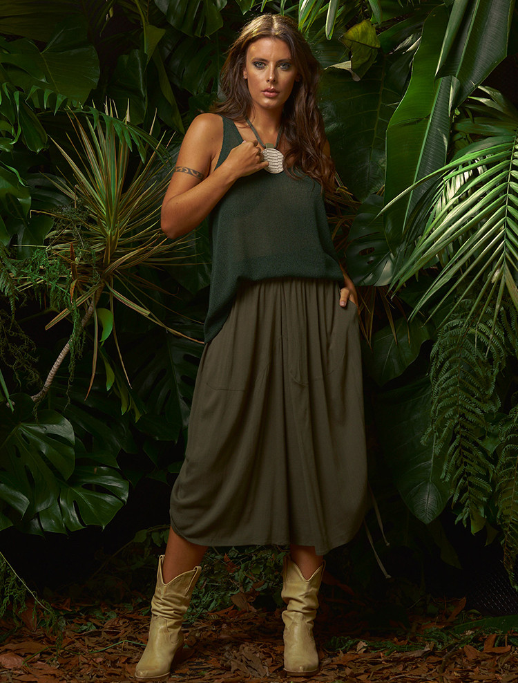 Regata em trico de viscose, modelagem evasê (mais larguinha na cintura). As costas tem o estilo nadador e é mais comprida que a frente.
