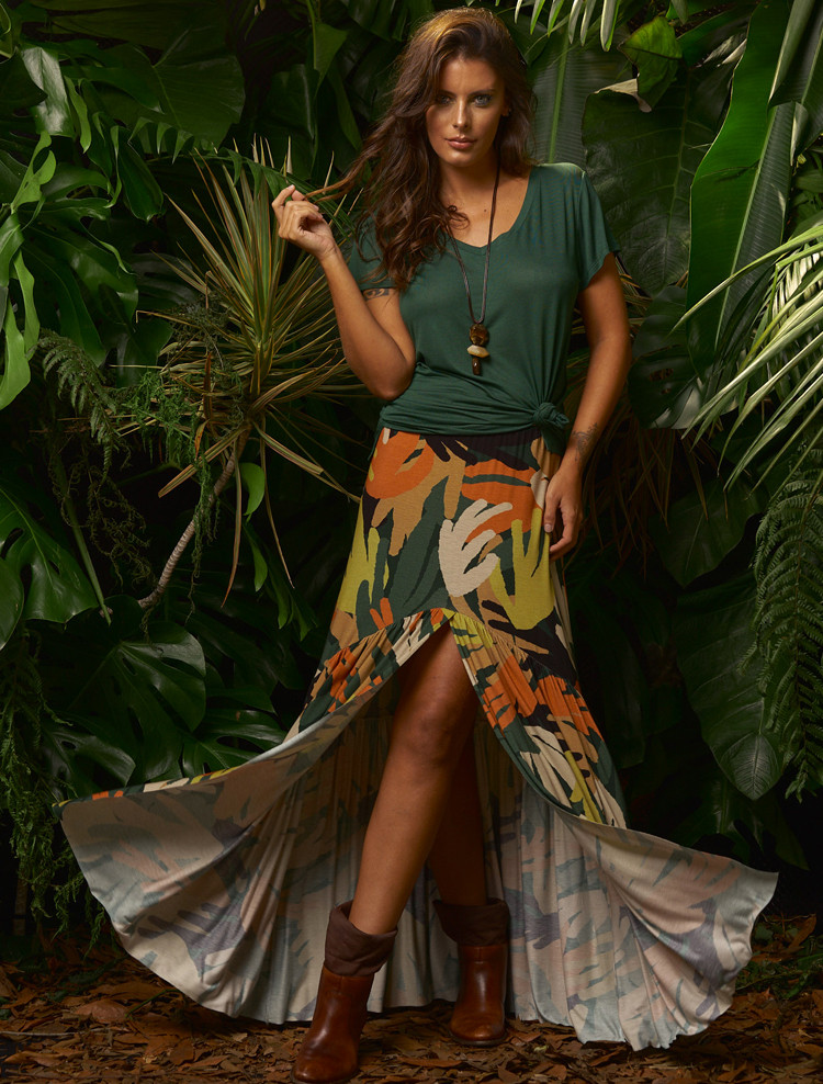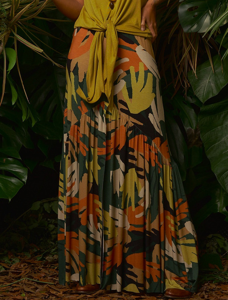 Detalhes do ProdutoAbertura FrontalElástico na cintura Estampa ExclusivaComposição96% Viscose04% ElastanoMedidas da PeçaU – SAIAS - Comprimento 105 cm | Quadril até 117 cm | Cintura até 100 cm
