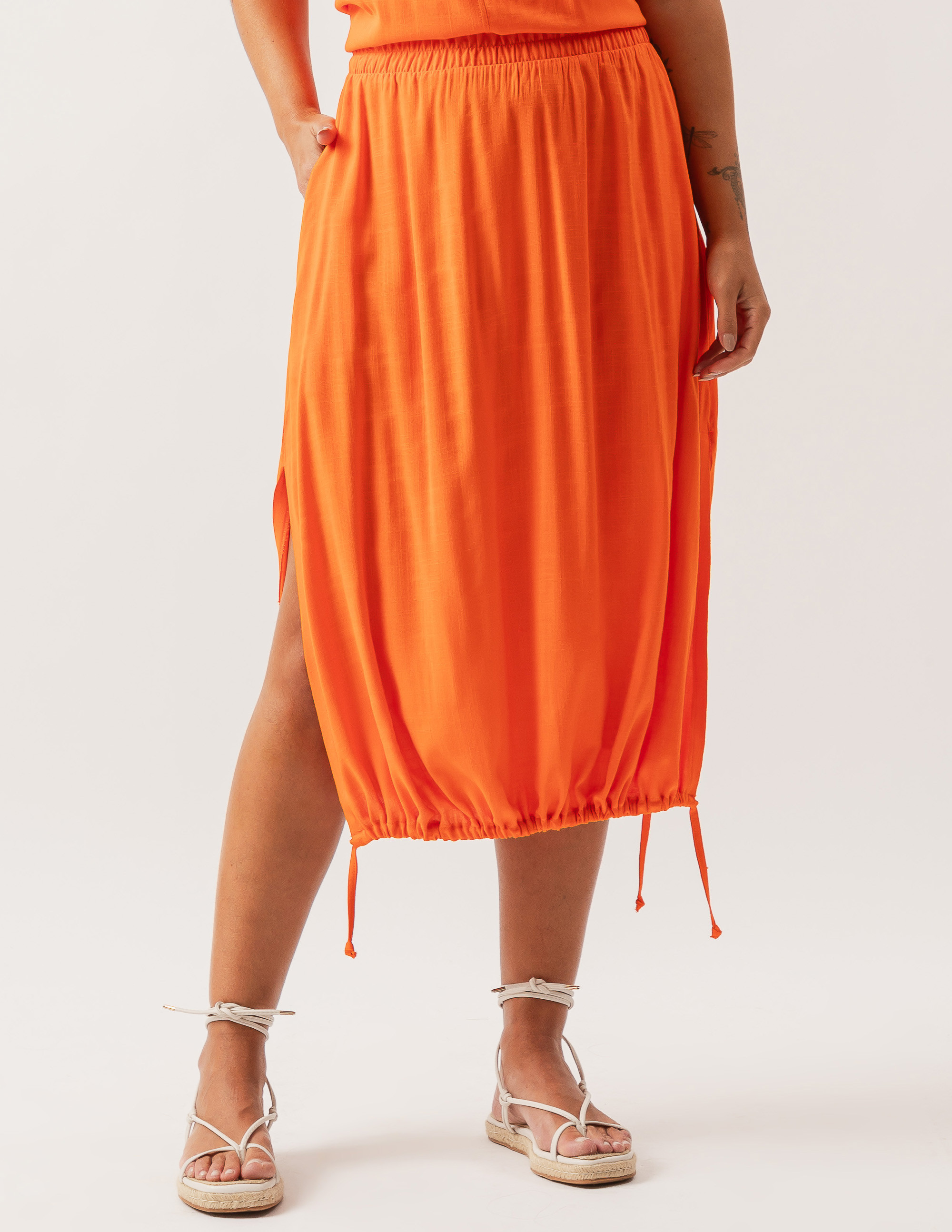 Detalhes do ProdutoFranzido na barra.Elástico no cós.Fabricada em trama de linho.Bolsos laterais.