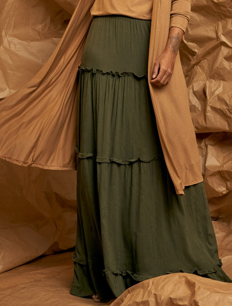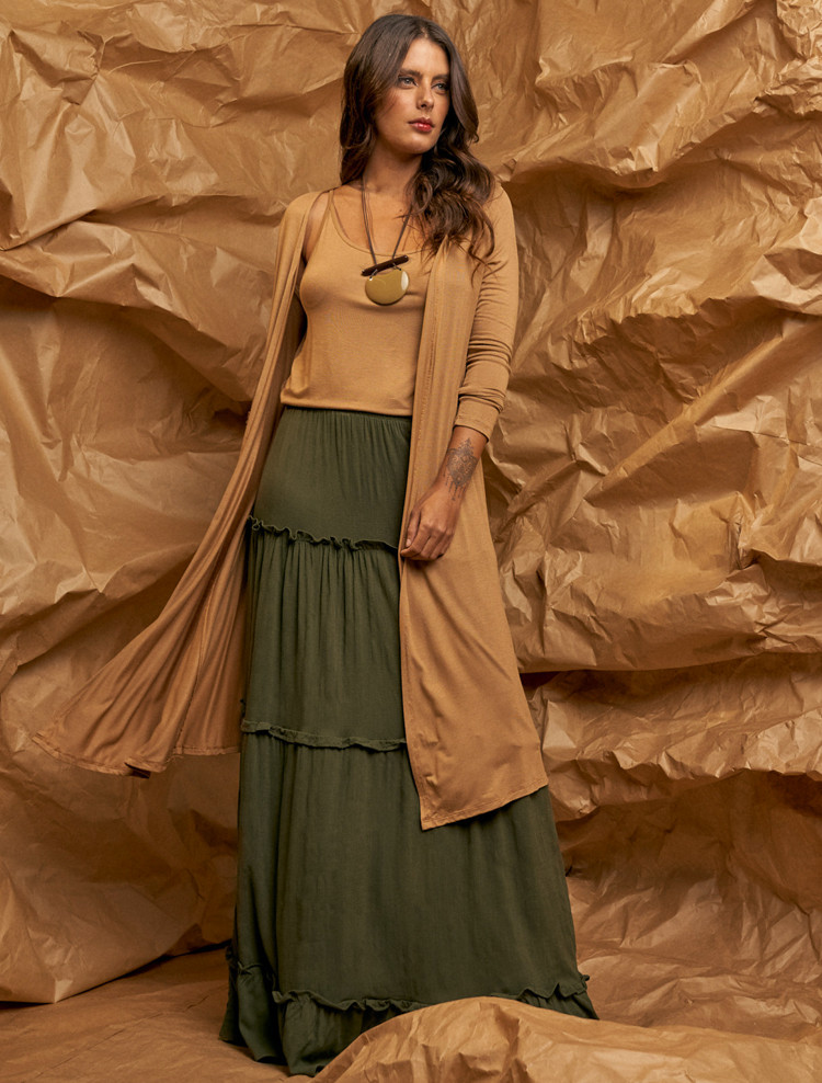 Detalhes do ProdutoLinhoSaia LongaElástico CinturaComposição96% Viscose04% ElastanoMedidas da PeçaU – SAIAS - Comprimento 105 cm | Quadril até 117 cm | Cintura até 100 cm