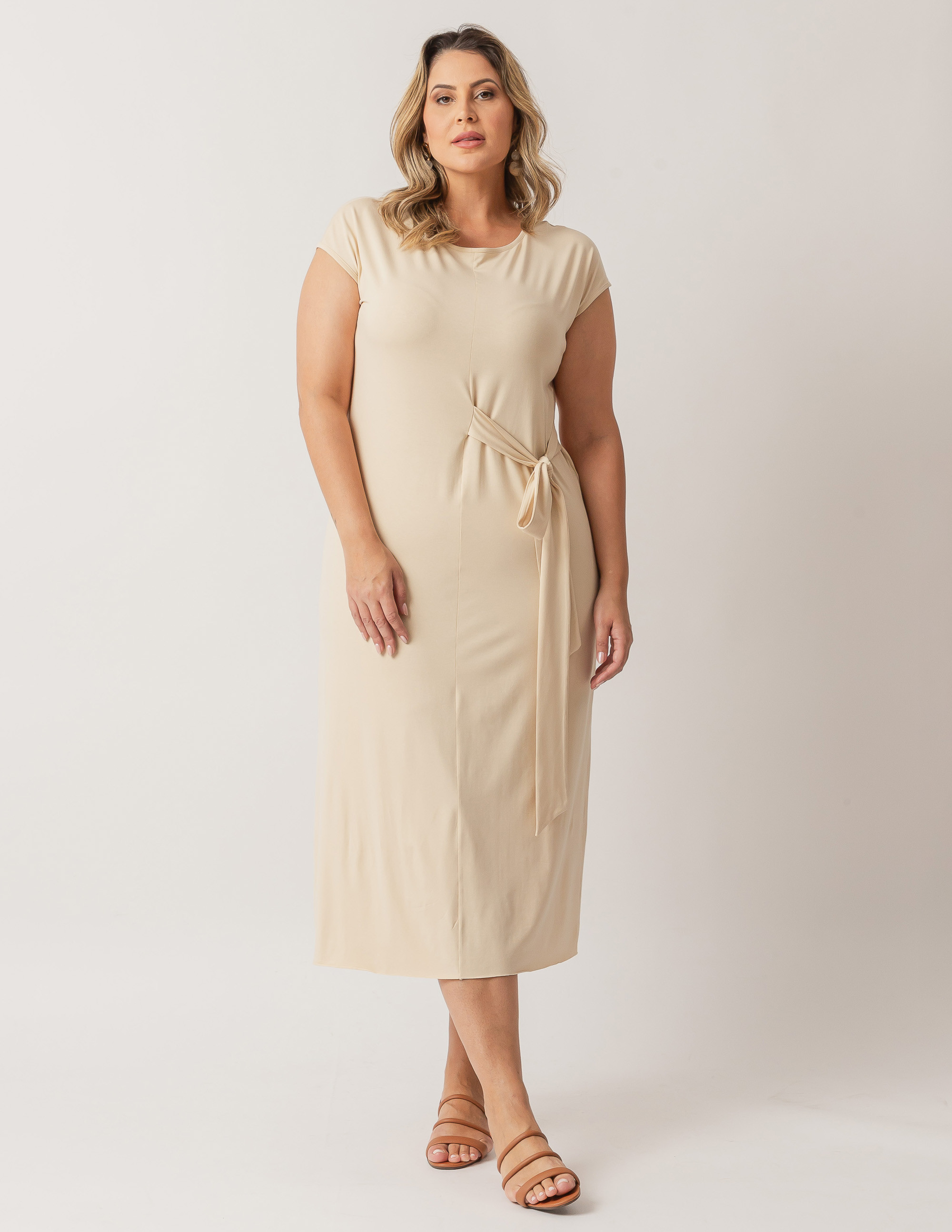 Vestido midi versátil e moderno, com duas tiras para amarração, que podem ser para a direita ou para a esquerda do corpo, proporcionando um lindo drapeado. O decote é redondo e conta com mangas curtas. O tecido é de malha de viscose com elastano, extremamente confortável, macia e com ótimo caimento, que marca pouco o corpo. Medidas da Peça - Tamanho únicoComprimento 129mBusto 112cmCintura 110cmQuadril 128cmComprimento Ombro 21cmTamanho da Faixa 77cm*Nosso tamanho único veste de 38 a 44/46, confira clicando na Tabela Abaixo