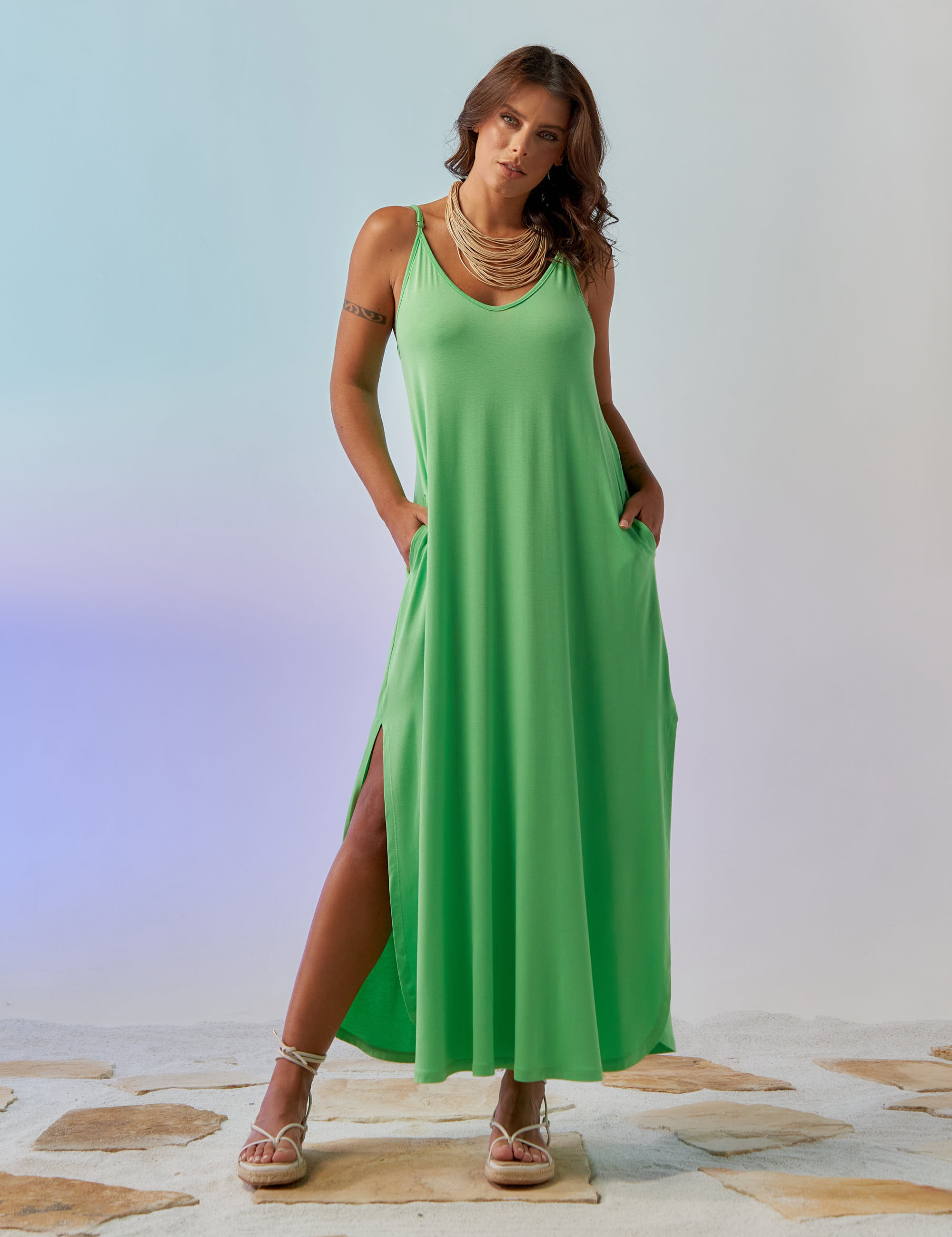 Vestido estilo regata, alças reguláveis, abertura lateral na altura dos joelhos e bolsos. Tênis, rasteirinha e até salto completam e comprovam a versatilidade deste vestido.